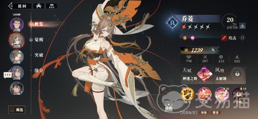 最后推荐的良将是乔菱,她以其附带牵制效果和强大的法术伤害而脱颖而出,乔菱会造成106%的法术伤害,同时击退敌人30%的行动条,有效打乱敌方的战斗节奏,升级后乔菱的第1段绝技伤害系数提升至87%,第2段绝技伤害系数也相应提升至111%,她的技能上还带有自强化的效果,天赋效果可以为友方全体带来一层神奇的神速效果,此效果持续时间长达2回合。乔菱自身在回合结束时,也会获得一层舞动效果,同样持续2回合,舞动这一效果每层能够提升10%的伤害增加,而且舞动效果最多可以叠加至2层,不过需要注意的是,神速和舞动效果都有各自的上限,分别为1层和2层。