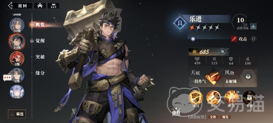 然后是乐进,他以其全体输出方式和引领同排友方增益的能力而著称,战斗一开始乐进便能为队伍带来15%的增伤效果,同时造成123%的物理伤害,随着等级的提升,乐进的绝技伤害系数不仅飙升,还赋予了自身及同排友方生命加成、攻击加成和防御加成各10%的全面提升,进一步增强了队伍的整体实力,在这一点上面前期的增伤完全可以用乐进。