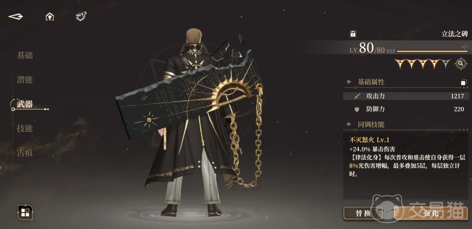沙琪玛的专武是立法之碑,这个武器能带来攻击力和防御力的加成。武器同调技能上是“不怒之火”,能增加24%的暴击伤害。触发【律法化身】被动技的话能增加每次普攻和重击时能获得一层8%光伤害增幅,最多能叠加5层,每层拥有自己的倒数计时,也就是说如果能叠到5层的话,能维持这个增幅效果很长时间。