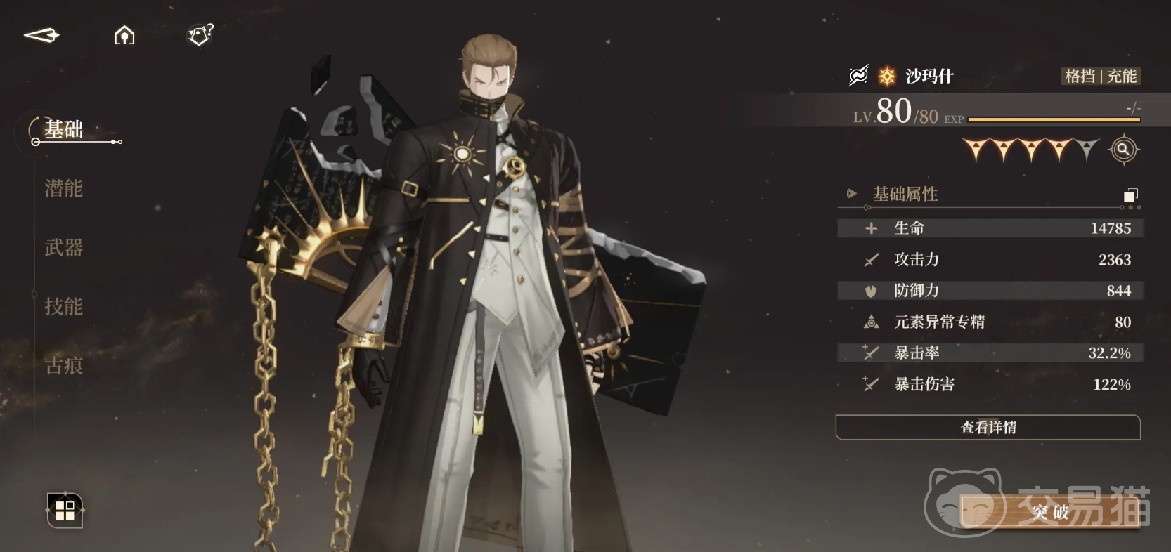在满级的沙琪玛属性上,生命值基本上能达到14000+,攻击力能达到2300+,防御力达到800+,元素异常专精能到80+,暴击率和暴击伤害这个数值还和角色的潜能和装备有关系。
