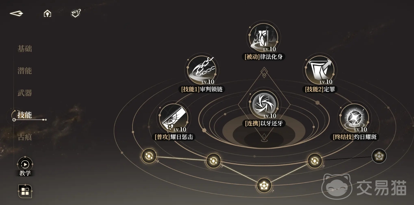 在沙琪玛的技能上,他的技能有普攻【曜日惩击】,技能1【审判锁链】;被动技能【律法化身】,被动的连携技能【以牙还牙】,技能2【定罪】,终结技【灼日耀斑】。