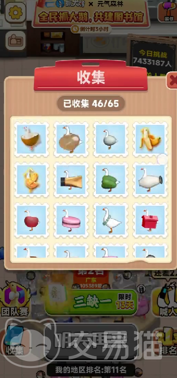 三缺一在游戏当中代表的是两种收集元素,一个是基础大鹅的类型收集元素,它要求玩家收集普通大鹅、合成大鹅、稀有大鹅,这3种不同类型的大鹅。