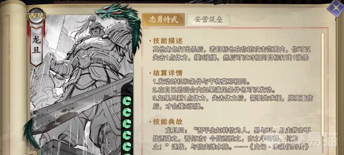 作为一名初始体力就有六点的武将,龙且在实战中自然非常强力,同时他也很适合走发育流路线,既屯出关键牌后进行爆发,并利用忠勇恃武的特性来寻找收割的机会,没有好机会时还能利用安营筑垒来增加体力上限进行防守,所以总的来说可谓攻防一体。