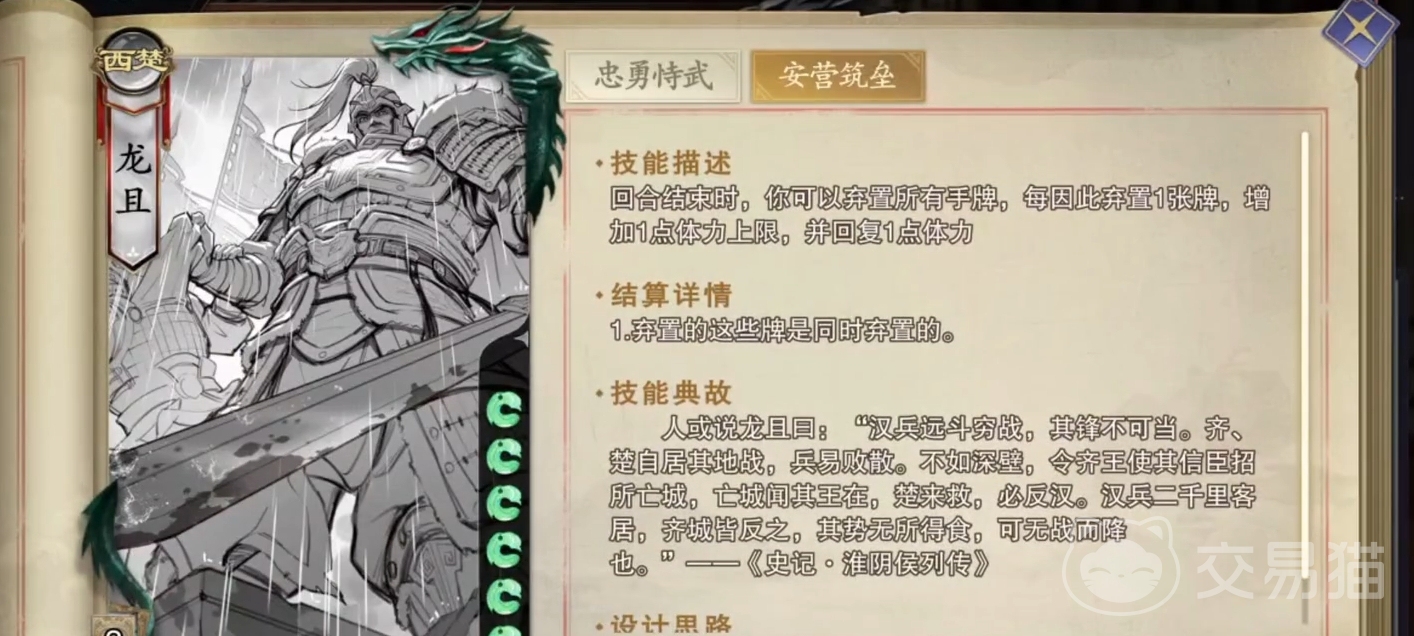 安营筑垒是龙且的一个防守技,在自己的回合结束阶段,龙且能自主选择是否将手里的手牌都弃掉,并能根据所弃的牌数来提升自己的体力上限和恢复体力。要注意,提升的体力上限是永久存在的效果,即便再次轮到龙且的回合,该效果依旧后存在,因此只要龙且能在手里留足三张牌,每回合都能稳定获得回三体力和体力上限提高三点的收益。