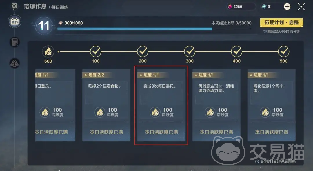 角色升级升级需要阅历,积累足够的阅历才能提高角色的等级。这首词打造/建造配方,制造玛卡,获取道具,或者突破天赋等等行为都是能拿到较少的阅历的,但是这些都是首次能获得,比较常规的方式大家应该掌握。第一个就是”每日训练”,这就是每日必做任务,这里每天会有9种不同的任务,每完成一个就能得到100的活跃度,500活跃度就能拿到全部奖励,也就是说可以挑选相对简单的去完成。