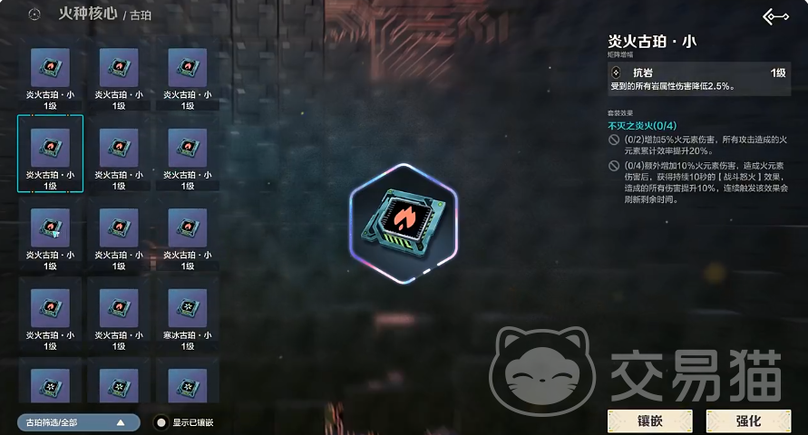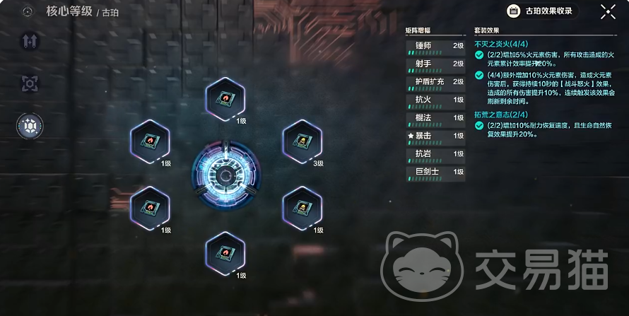 3、古珀。超控核心等级升高后,全部可解锁6个槽位,能装配6片古珀。该分类比较多,有迅风、寒冰、炎火、疾电、坚岩、拓荒、庇护、狩猎、驾驭。小的蓝色的品阶最低,中型的紫色品阶更近一步,最高的就是大的橙色的。同类的古珀不管什么品质都能达成套装的效果,有2件套以及4件套,两件套能增强属性伤害以及元素积累的效率,四件套会额外增加对应元素伤害,外加一种被动效果。