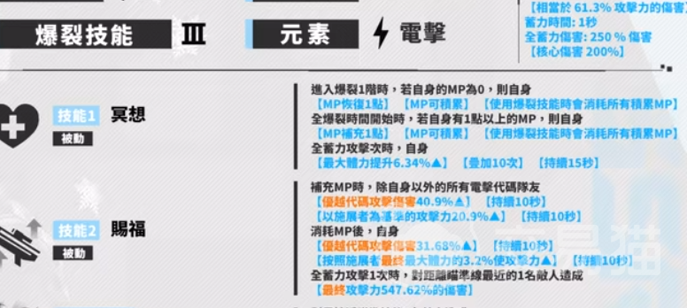 技能2是辅助技能,在补充mp的同时所有电击的角色都能获得攻击伤害的提升,能够维持十几秒。除此之外基准的攻击力的攻击也会提升12%。当mp消耗完毕之后,恢复主控最大体力的攻击力数值。【钻石尘埃】根据mp值发动最强直线攻击,伤害达到mp的40%,冷却时间为40s。