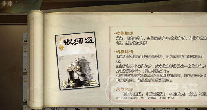 床被上银狮盔不仅能够恢复武将的体力,还能修改自身受到的伤害,若是武将受到的伤害已经超过了1点,那银狮盔可以直接把伤害降低为1点,之后卡牌就会自动销毁。