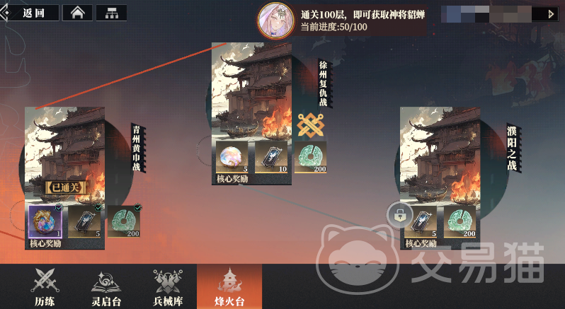 烽火台是分为几个大关,每关中有很多个小层,截止枭鸣测试一共有100层,如果可以顺利通关100层,会得到神将“貂蝉”。烽火台每一层的难度递进没有那么明显,不过通常关底会比较有挑战性。