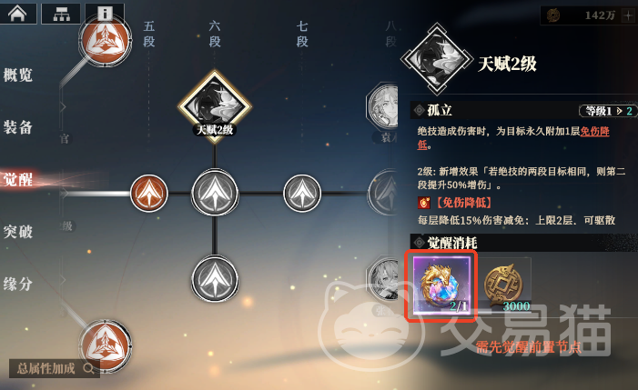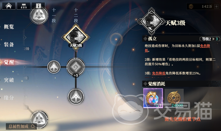 天赋3级则需要到12段才能点,同样是以张郃为例,他的天赋是绝技造成伤害的时候可以给目标永久增添1层免伤降低,可以降低敌方15%的伤害减免,最多能叠2层,可以变相理解为30%的易伤。升到3级,易伤最多可以来到50%,这个加成幅度还是很高的。