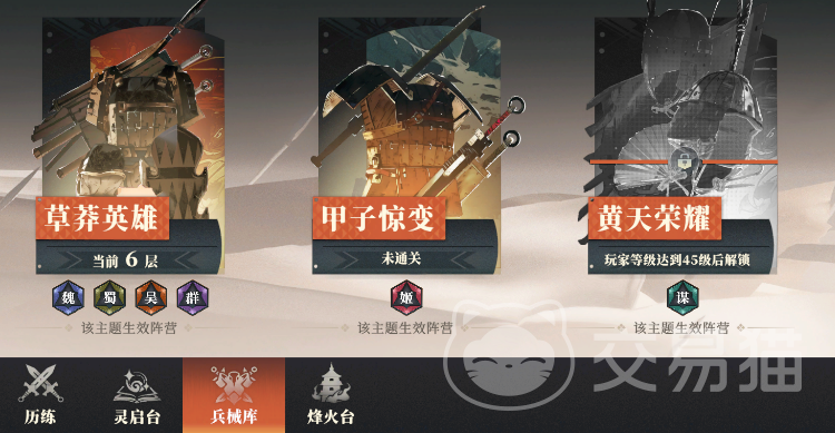 装备的获取并不像养成材料那样可以反复刷,获取饰品等装备的主要来源是打兵械库,打完一层就可以获得这一层的奖励并解锁下一层,而先前的那一层则无法再挑战。兵械库有草莽英雄、甲子惊变、黄天荣耀这三部分,有对应阵营主题的英雄优势,在这些关卡里只有该阵营的加成光环会生效。