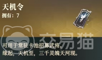 天机令在游戏中可谓是核心道具,它与常驻卡池有着紧密的联系,如果想要获取常驻池中的武将,那么天机令就是必不可少的关键道具,作为抽卡道具,获取它是玩家们游戏进程中的重要环节,毕竟大家主要的常驻角色来源就指望它了。