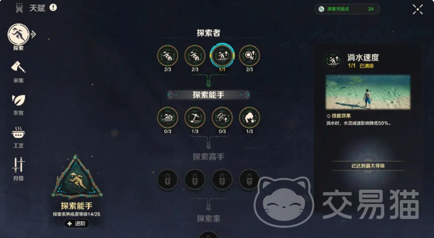 角色天赋有五类,探索,农牧,采集,工艺,狩猎,探索能提高角色探险时的耐力消耗,翻滚跳跃耐力回复等等效果;采集主要就是针对各种资源;农牧能提升角色农田种植,钓鱼等等;工艺天赋能提高吃下食物后获得增益buff的持续时间以及效果;狩猎天赋主要是降低战斗时攻击的耐力消耗。任何行为动作都是能提高天赋经验值的,天赋升级后能获得技能点,日常各种行为达到熟练度后,就能进阶天赋等级。