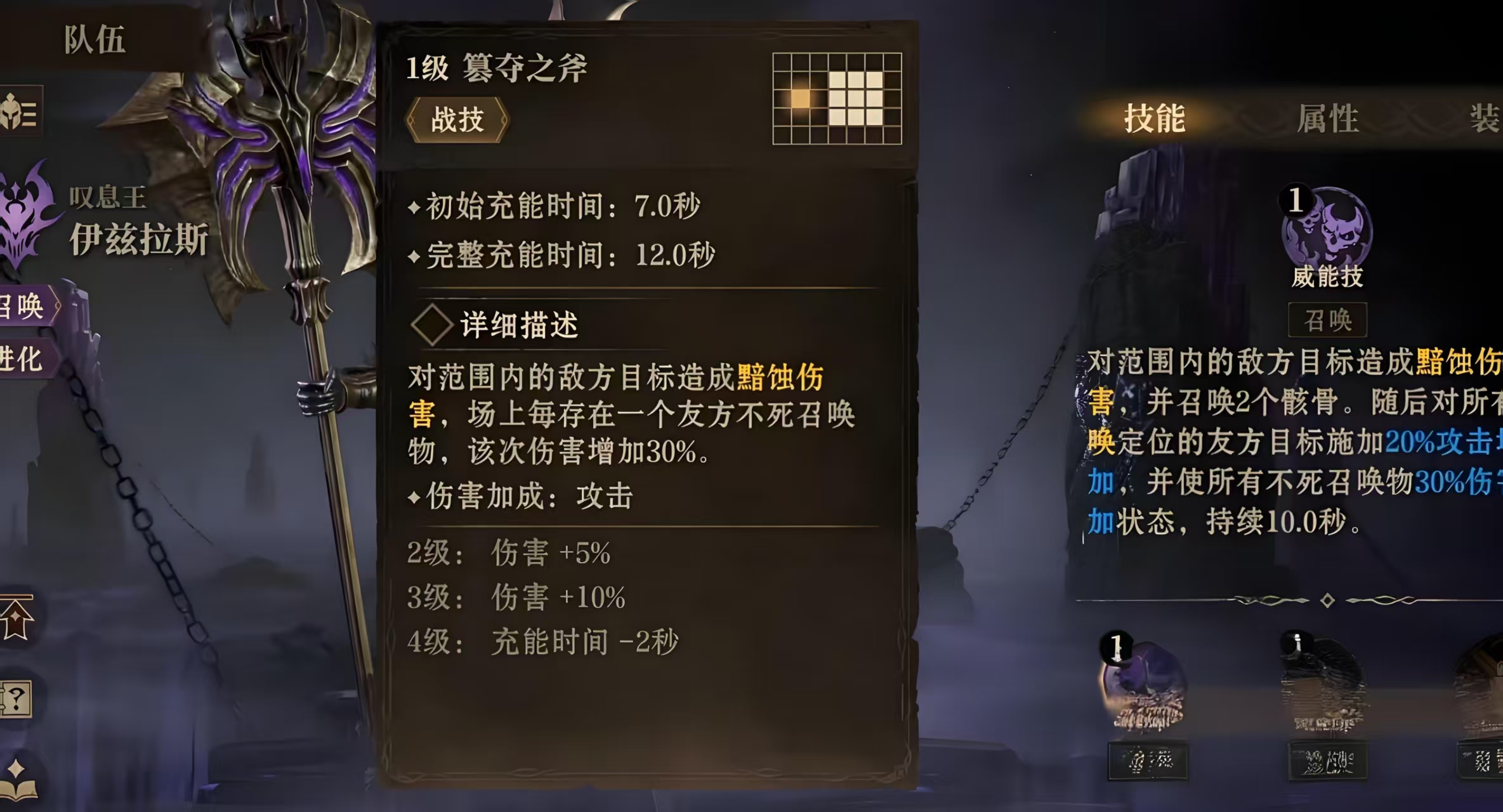首先他的队长技能是攻击光环,可以提升所有有方目标30%的攻击力,而且能够增强队伍的整体输出能力。被动技能当乙方的不死召唤物死亡三秒之后,会在死亡的位置上重新召唤一个逐渐失去生命值的骸骨,还过早晨的伤害会按一定的比例转化为生命值,但每秒损失最大生命值的10%。骸骨可以分担防御压力,对于敌方造成威胁,这样就可以打乱敌人的进攻节奏。