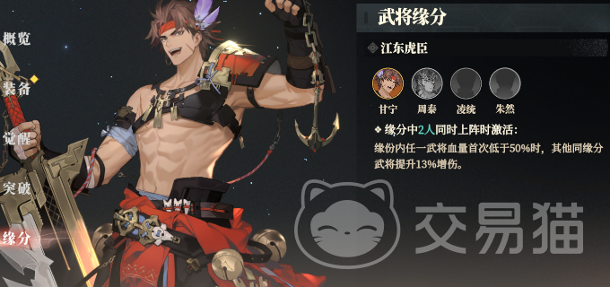 如图所示,在武将界面的最下方一栏可以看到“武将缘分”,武局缘分是特定武将共同上阵的时候可以触发的增益。有的是需要2人同时上阵集火的,有的是需要3人同时上阵才能激活的。