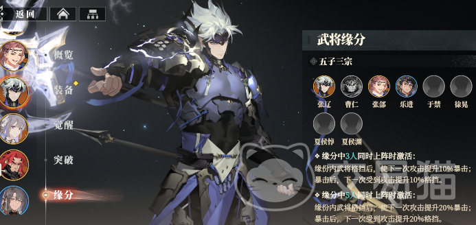 甚至还有5人同时上阵的激活的阵法,比如说这个“五子三宗”,张辽、曹仁、张郃、乐进、于禁、徐晃、夏侯惇、夏侯渊,其中头像是灰暗的只有名字的是这个武将还没有实装。满足条件变可以激活效果,例如这里的缘分内武将格挡后下次攻击提升暴击,暴击后下次受击提升格挡。