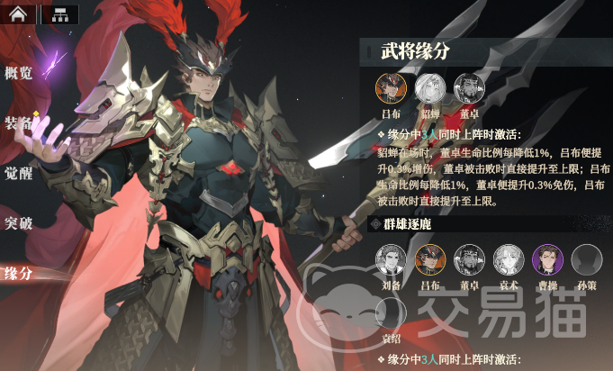 比如说吕布,他就拥有飞将所望、美人连环、群雄逐鹿这三种缘分,如果凑出吕布、貂蝉、董卓、曹操、张辽、陈宫/高顺/吕玲绮就可以获得3种缘分增益。