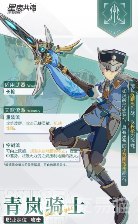 青岚骑士属于攻击型,能力比较均衡在各种战斗环境下都有不错的作战表现,他的普攻会进行最多4段物理攻击,“疾风刺”会消耗50点勇气,向敌人高速戳刺3次,“翔返”会消耗35点勇气,跳跃到空中向敌人发动从上往下的攻击,“风姿绰约”释放后会先震慑前方的目标,随后对其造成一次物伤,效果激活期间会让自己的力量提升并且持续回复70点勇气,“螺旋刺击”会向目标方向刺出终结一击,造成范围物伤,终结技会奋力冲进敌群中,对范围内敌人形成物伤并将他们击飞,同时回复自身100点勇气。