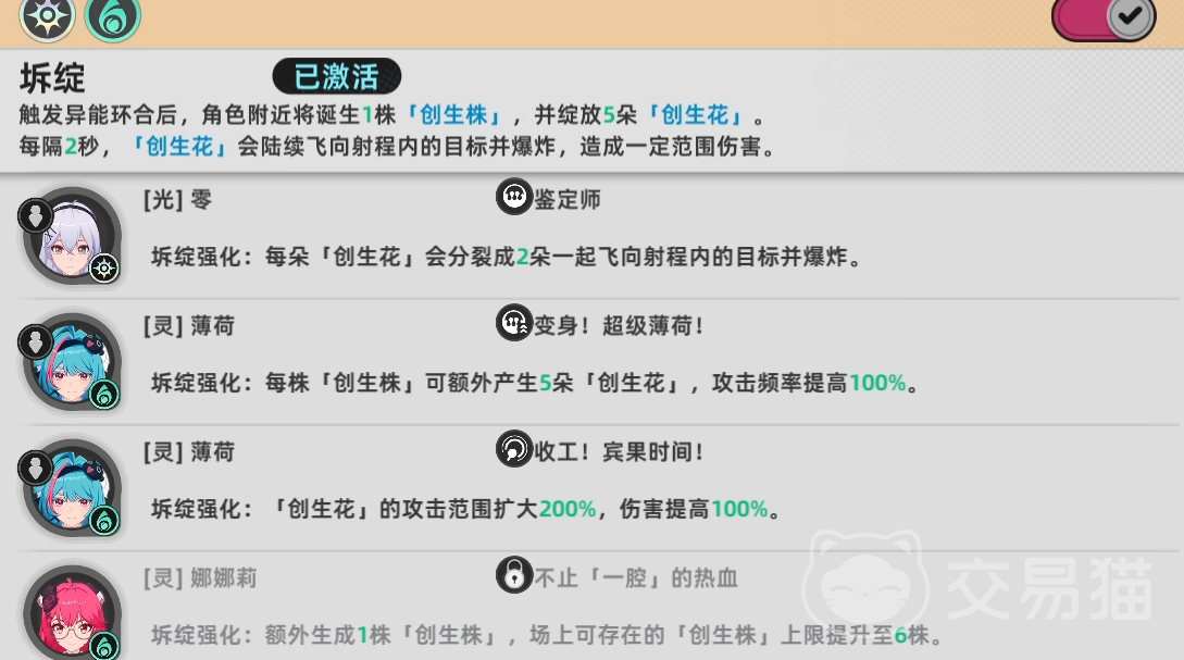 如果队伍中包含零和薄荷这两名角色,坼绽效果可获得三重强化。零的强化使每朵创生花分裂成两朵,相当于一朵变成两朵攻击敌人,而薄荷的强化则使每朵创生株额外生成五朵创生花,原本五朵可翻倍至十朵。再结合零的分裂效果,最终可达到20朵创生花同时攻击敌人,极大提升持续伤害能力。
