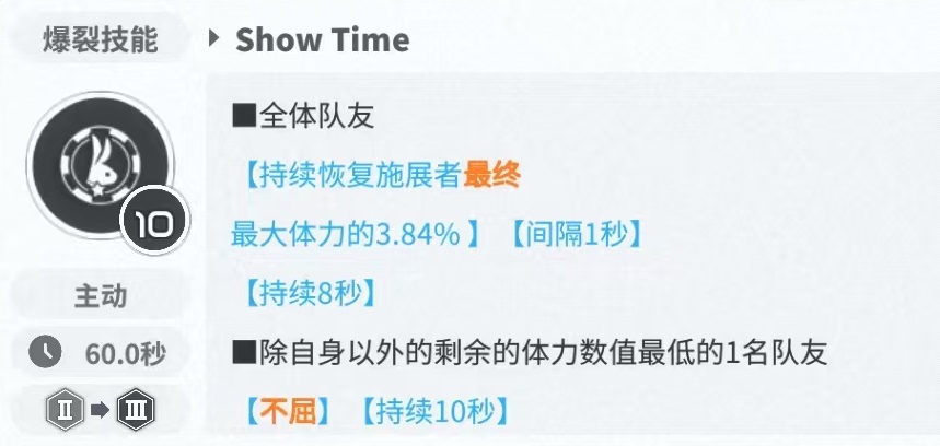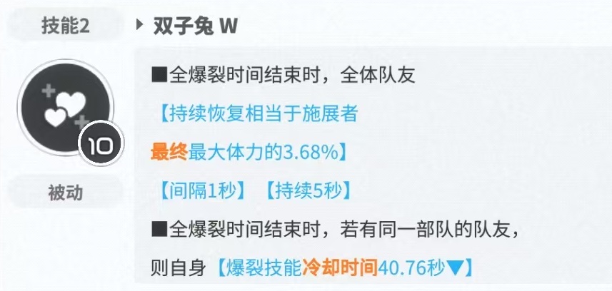 第2个被动双子兔w,在全爆裂时间结束时,全体队友将获得持续恢复能力,按照布兰儿的最大体力值百分比计算,持续5秒钟。全爆裂时间结束时,如果有同一部队的队友,还可使自身爆裂技能冷却时间降低。爆裂技能对全体队友生效,持续恢复体力,持续8秒钟。除自身以外,剩余体力数值最低的一名队友还将获得不屈效果,持续10秒钟。全体敌人受到的伤害提升,持续10秒。