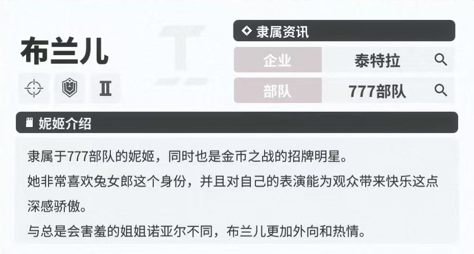 在游戏中布莱尔是属于777部队的角色,是金币之战招牌明星,也被很多玩家称为兔女郎,可见他在外形方面确实引人关注。她是诺亚尔的妹妹,两个姐妹有着完全不同的心情,今天小编来讲下胜利女神新的希望布兰儿怎么样。想必大家最关心的还是在实践中可以发挥出哪些效果,这就必须先了解清楚技能。