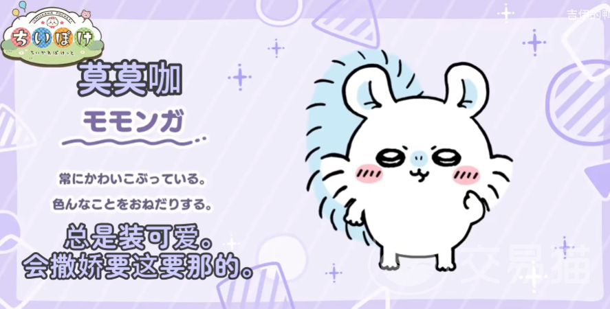 口袋吉伊卡哇中的角色很多,他们都扮演着不同的位置以及形象。那么口袋吉伊卡哇莫莫咖怎么样?其实莫莫咖特别受人欢迎,因为他有着一张人畜无害的脸。并且看上去好像即将哭泣的表情,也是让人忍不住想要将他抱在怀中安抚一波。不过他的能力并没有那么柔弱,更有一些强大的能力等待我们发现。