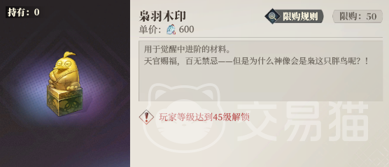 枭羽木印是一种觉醒材料,大多前期时候用不上,是要到比较靠后的时候才会解锁。可以在商店中的“珍惜材料”那一栏里使用苍岩石兑换,单价2000一个,最多可以换50个。