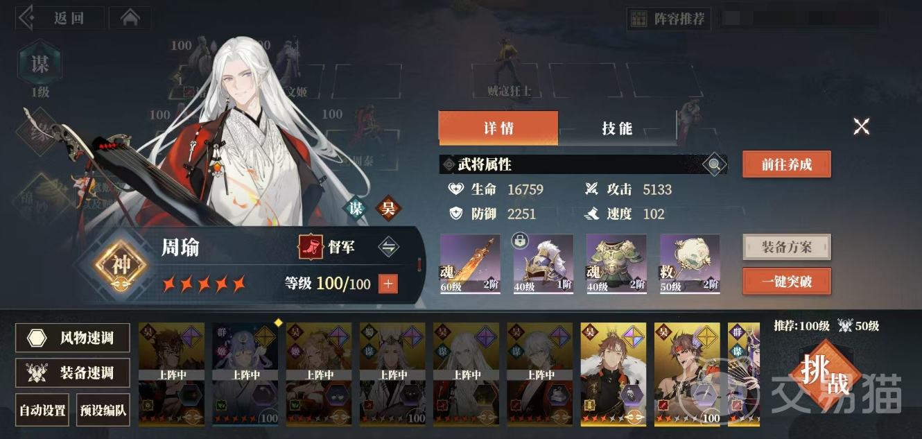 一个武将培养到这个阶段基本上可以说就是毕业了,剩余的就是捣腾装备了,获取更高品质和等级的装备,当然有套装效果是最好不过了。通常装备上有一个很大文字的就是有套装效果的。