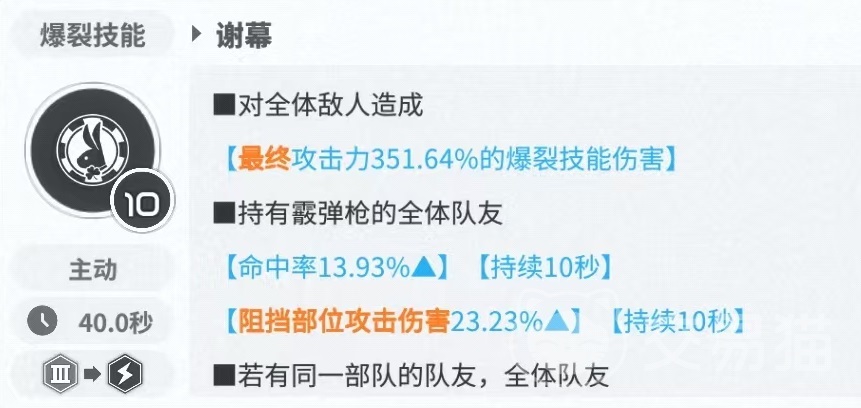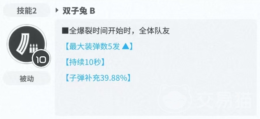 第2个被动技能双子兔B,在爆裂时间全开时,全体队友获得最大装弹数提升,子弹补充补充等效果。爆裂技能谢幕,对全体敌人造成爆裂技能伤害,所有持有霰弹枪的队友提升命中率,提升阻挡部位攻击伤害。如果有同一部队的队友,那么还有额外命中率提升效果。从这些技能效果可以看出,无论是伤害还是增益这方面都做得比较出色,所以成为现在很热门的人选。再加上自身外观方面也比较引人关注,肯定人气很高。