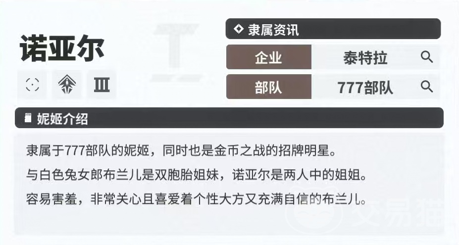 诺亚尔是属于泰特拉企业,777部队,是金币之战的招牌明星,和白色兔女郎布兰尔是双胞胎姐妹。自身属于风压属性,对于铁甲代码的敌人有额外伤害。使用的武器是霰弹枪,在近战时有着非常强的杀伤能力,武器最大装弹数9发,换弹时间0.7秒,没有蓄力攻击的特点。她的第1个被动技能幸运符,在自身体力70%以下的时候,全体队友都能获得攻击力提升效果。