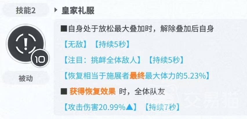 第2个技能皇家礼服,普通攻击次数达到43次时,自身将获得放松效果,恢复一定体力,可叠加20次。当自身放松叠加到最大层数时,将解除叠加,然后自身获得五秒无敌,挑衅全体敌人,恢复体力值。在自获得恢复效果时,全体队友还有攻击伤害提升的效果。在这些技能中,第1个被动是皇冠最重要的基础技能,该技能带来巨大的攻击力增益,换弹速度也很重要,所以需要优先去提升。