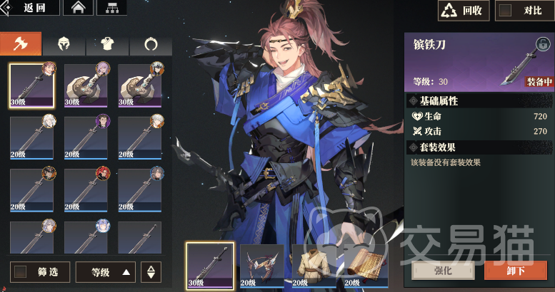 装备一共有四个部位,武器、头盔、铠甲、饰品。这其中头盔和铠甲主要是加血防的,武器和饰品可以加攻击,武器加的比较多。当然,同品质的武器加的属性也会有一些区别,比如说这里的青铜斧强化30级加288血351攻击,而同样30级的镔铁刀加720血270攻击。