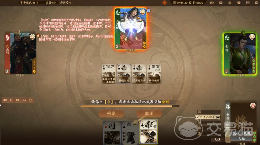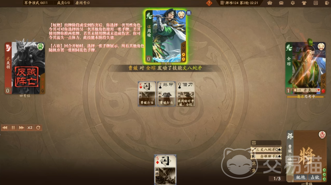三国杀一将成名曹媛的技能详情都给大家讲解到位了,相信现在朋友们应该都清楚她的能力了,很明显她是适用性比较高的一名武将角色,使用得当还是比较容易获得对局胜利的,值得小伙伴们去好好利用。