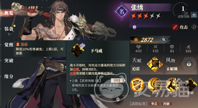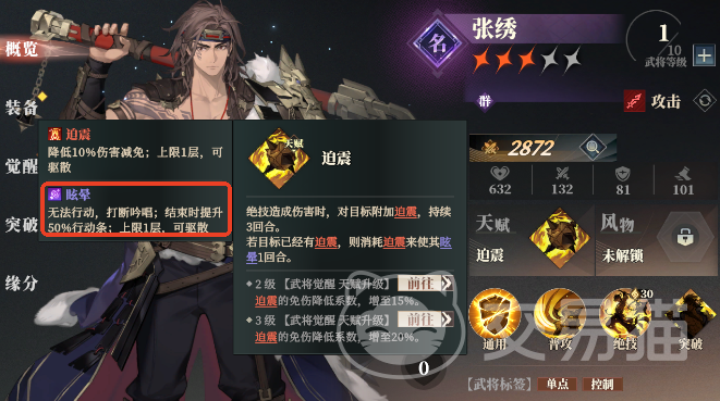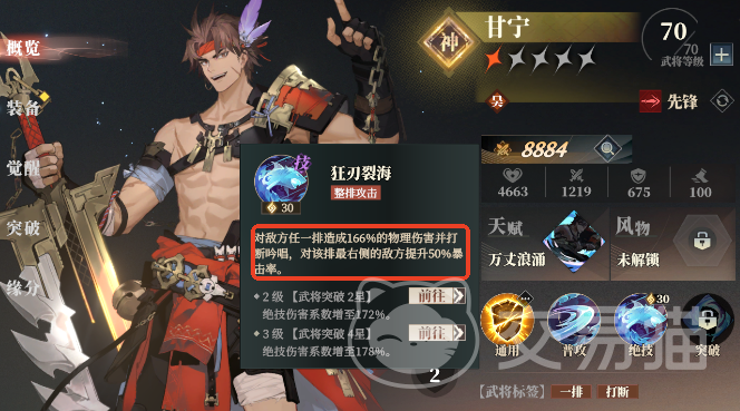 但是要注意甘宁的这个绝技能耗有30点,因此需要预留一定的战意来释放这个技能,不然就无法打断,敌人的一些关键性技能。当然除了特定技能的打断外,一些效果也可以打断,例如眩晕。张绣的天赋就可以对已经被挂上破震的敌人造成眩晕,而突破技解锁后入战就可以给敌方最高攻击力的单位施加破震效果。