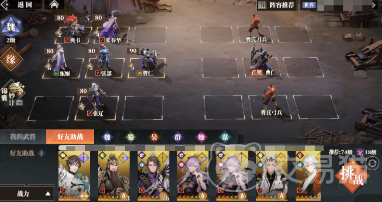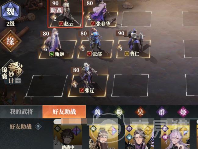 好友的助战武将,每单个武将每天只能使用一次(提升好友关系可以借2次),因此也要规划者使用,当己方练度不是很高的时候,好有的高练度武将尽量放在关底对付高难敌人的时候用。助战武将被借用可以获得苍岩石奖励。