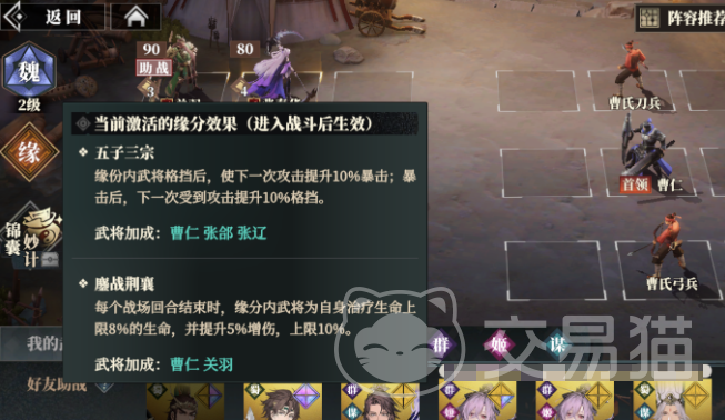 助战武将会有一个标记说明是助战,而且助战武将也是可以触发缘分增益的,比如这里魏国阵营的武将居多,对方是阵容需要单点突破强的武将,刚好关羽就是单点能力很强的,摆上阵刚好可以触发鏖战荆襄的加成,每回合结束有自疗和增伤。