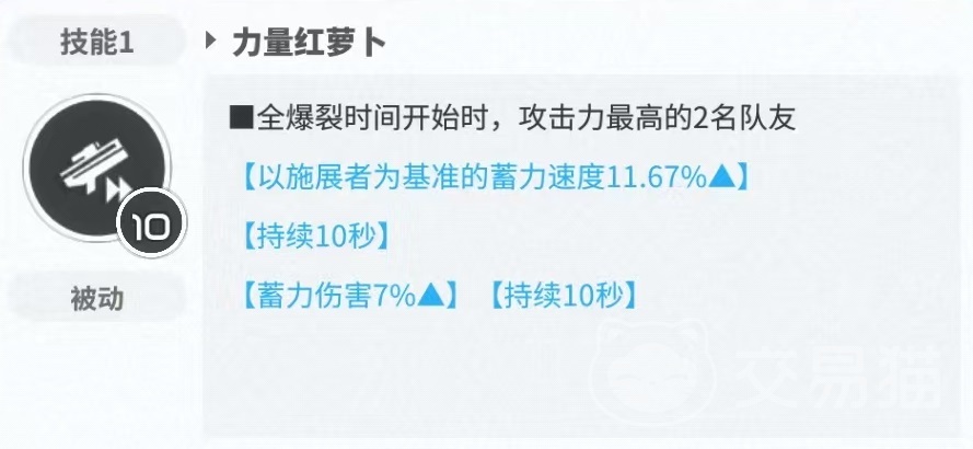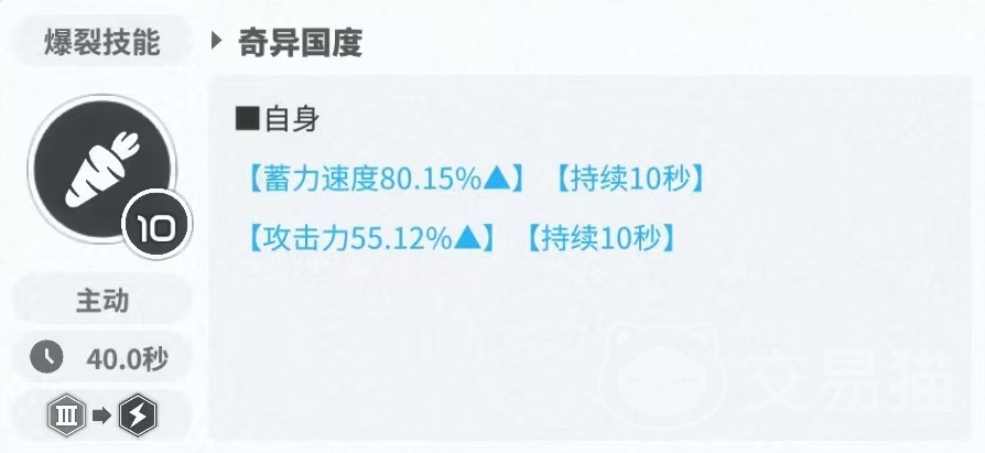 第2个被动技能健康胡萝卜,当爱丽丝自身体力为80%以上的时候,自身获得穿透特化,在自身体力降到80%以下的时候,自身获得恢复效果,这两项都是持续性的。爆裂技能奇异国度,自身提高蓄力速度,提高攻击力,持续10秒钟,提升的数值非常可观。爱丽丝之所以可以在很多场景中见到,是因为在故事主线和boss战中,都是非常不错的打手,这些技能效果是非常适合很多不同pve队伍搭配使用的,例如黑白兔队伍,皇冠队伍等。