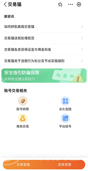 第三,官方客服不仅能解疑答惑,还能给出验号报告。客服为卖家和买家服务,全天实时在线,解答各方面的难题。进入交易猫平台之后,玩家通过联系客服按钮咨询,还能学习防骗安全小知识。