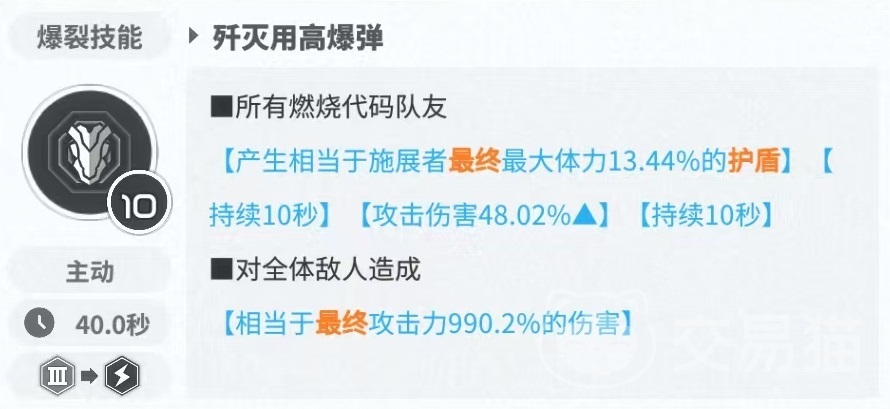 爆裂技能歼灭用高爆弹,作用于所有场上的燃烧代码队友,产生相当于施展者13.44%最终最大体力的护盾,持续10秒钟,还有攻击伤害提升效果,同样持续10秒中,对全体敌人造成一次高额伤害。通过这些技能效果,大家就可以大致了解出这名角色的应用场景以及具体的强度。首先是在对护盾方面有着不错的发挥,而且对于燃烧代码队友都有增益提升效果,在搭配时候尤其要注意这一点。大招不仅给团队带来了护盾,更是伤害非常出色。