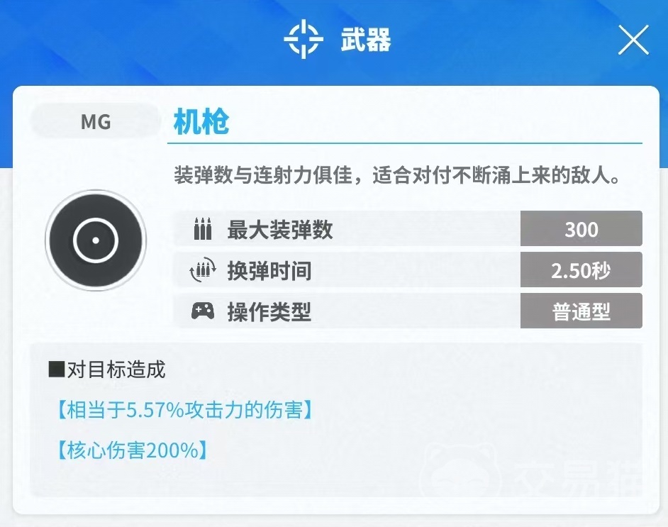 该角色是属于燃烧代码,它可以对风压代码的敌人有额外伤害加成。自身使用的武器是机枪装弹高,连射能力强,在很多战斗中都有不错的输出能力。最大装弹数300发,换弹时间2.5秒,操作的时候不需要蓄力,每一发子弹都可以对目标造成攻击力5.57%的伤害,对核心的伤害为200%在游戏中的定位属于火力型,以高攻击力有效打击敌人。