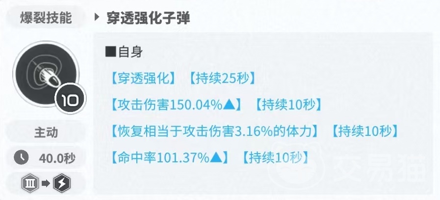 爆裂技能穿透强化子弹,使得明日香自身获得攻击伤害提升,恢复体力提升,命中率,穿透效果提升等,对于生存和进攻能力都是很好的强化。也是明日香伤害飙升的地方,提升的命中率也可以更好地发挥出技能二的效果,带来的恢复体力,也可以触发自身一技能,形成完美循环。