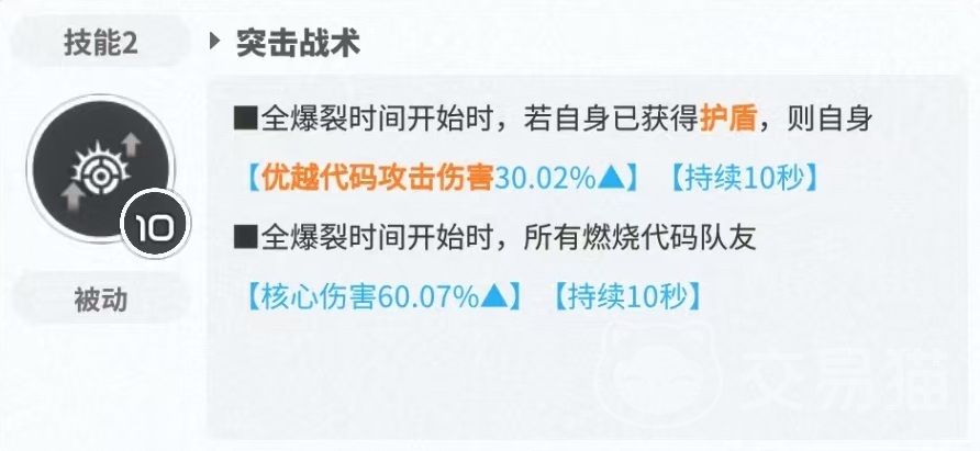 第2个被动技能突击战术全爆裂时间开始时,如果此时自身已获得护盾,则提高优越代码攻击伤害。全爆裂时间开始时,所有燃烧代码队友核心伤害提升。只要能获得独立护盾,那么明日香就会有伤害加成,独立护盾和通用护盾是不同的,这一点大家要清楚。一般来说只有富克旺、皇冠、蒂亚等角色可以提供独立护盾。所以对于明日香来说,要想达到所有技能都完善的程度,尤其是被动二,那么可以选择的搭配其实并不算多。但如果放弃了优越伤害加成,那么选择的范围就大了一些。