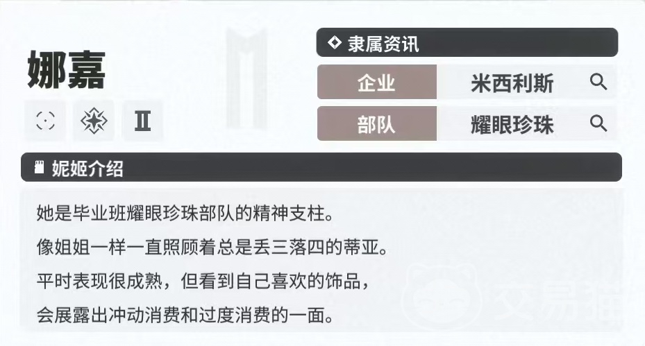 娜嘉是属于米西利斯企业耀眼珍珠部队,平时表现的很成熟,但是也有冲动消费和过度消费的一面。它是属于电击代码,对于水冷代码敌人有额外伤害。使用武器是霰弹枪,没有蓄力效果,最大装弹数九发,1.5秒换弹时间,是定位为辅助型的职业。第1个技能友谊守护,进行12次普通攻击时,队友掩体体力恢复,护盾生效时全体队友核心伤害大幅度提升。持续10秒钟。