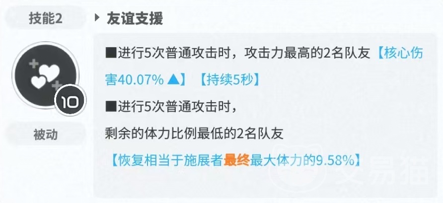 第二个技能友谊支援,进行5次普攻时,攻击力最高的两名队友提高核心伤害,进行5次普通攻击时,剩余体力比例最低的两名队友恢复体力。爆裂技能如果是和朋友们一起,自身获得穿透特化,全体队友获得攻击力提升,如果自身处于护盾生效状态,全体队友再次提升攻击力。因为这名角色可以提供独特的核心伤害增益效果,并且提供了生命和掩体恢复,这样在队伍生存能力方面的表现就变得非常出色,可以提供较高的进攻支持。