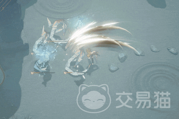 他的主动技“沧海尽扫”只能在防御姿态下使用,释放时会对指定范围内敌人形成物理伤害,并增加“天相”,自动技会对前方单体目标形成物理伤害,再进行一次扇形范围物理伤害,并附带破坏格挡条效果后根据当前姿态触发额外效果,如果是攻击姿态会瞬移到范围内血量最低的目标附近触发一次自动技,回复自身生命值后再返回原地,防御姿态则是获得“天相”。