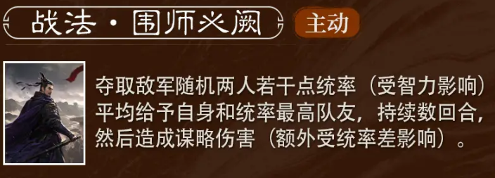 朱儁的战法便是围师必阙。这是一个主动战法,它的效果是夺取敌军随机两人若干点统率,这个夺取的统率是受到智力的影响。之后将夺取的统率平均的给予自身以及统率最高的队友,持续数回合,之后造成谋略伤害。