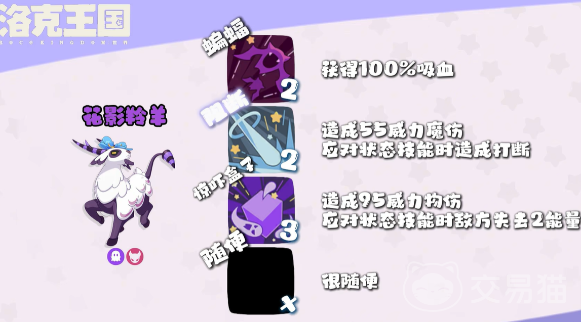 然后是花影羚羊,这是偏向控制类型的精灵,她可以携带蝙蝠技能,百分百吸走对面的血量来保障自己的健康,同时还拥有两个控制技能,一个阻挡打断对面的释放,另一个惊吓盒子减少两个能量,使得对面的能量无法短时间恢复上来哦。
