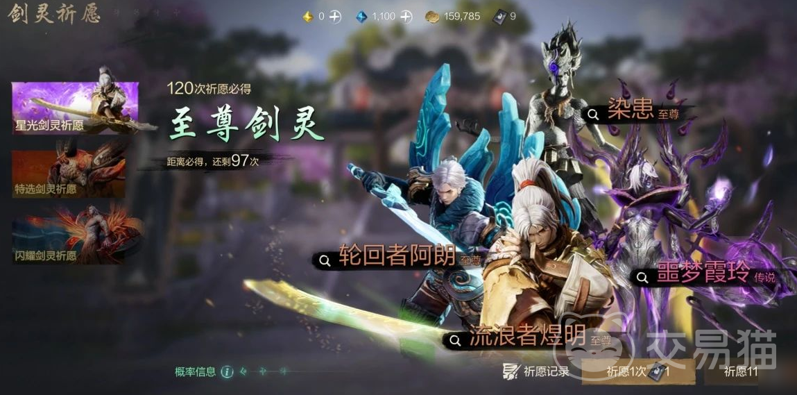 如果我们想要召唤他的话,那么可以来到剑灵卡池。就是所谓的剑灵祈愿,如果我们抽满120次的话,就可以100%获得一个橙色的剑灵。然后暴走守护兵队长就是一个橙色剑灵,所以我们可以不断根据自己的需求去抽取,不过不能保证100%获得。
