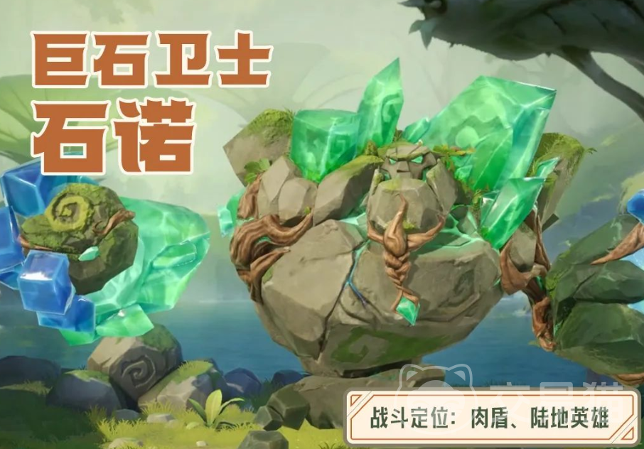 他是诞生于百年以前的森林守护者,虽然身躯庞大,但内心温柔,是整个战场上坚不可摧的肉盾,他的被动技是当自己累积所受伤害,超过生命上限15%时,向周围召唤并丢出一个小石头人攻击,该招式会优先丢向半径12格子内最远的敌方单位,小石头人会继承石诺12%的攻击力和生命上限,他的怒气技会将身边攻击力最高的敌人投掷到最远半径25格处,落地时会对范围内敌人造成攻击力280%伤害,并同时形成2秒的眩晕。