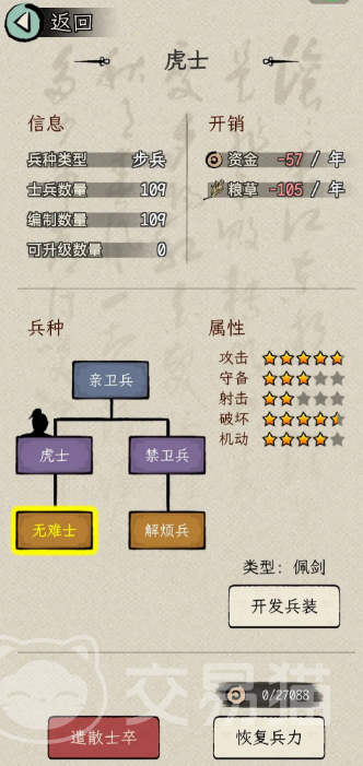 兵种方面,有两条路线可供选择。如果你偏爱远程攻击,无当飞军是个不错的选择,这支部队在战场上几乎无敌。要是骑兵才是你的最爱,飞熊军绝对值得培养,其属性和输出能力都是最顶尖的,紧随其后的是虎豹兵和西凉铁骑,它们在各种战斗中也非常有优势。
